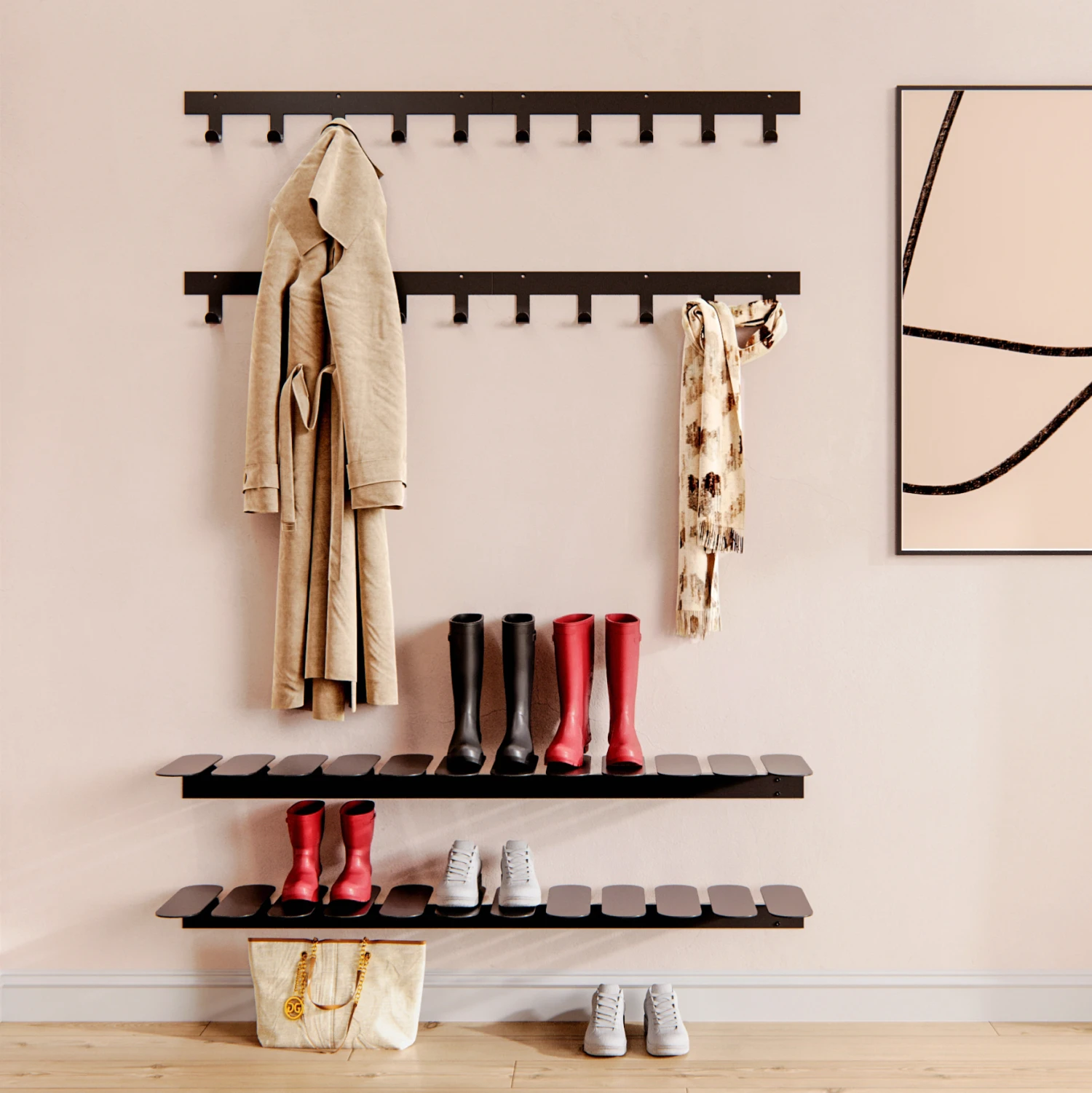 Step shoe shelf from Maze is a modern shoe shelf that can be combined to suit your personal preference and taste. The shoe shelf is designed by Gustav Rosén and looks like floating steps. It´s made in powder coated metal and is produced in Sweden. A functional and decorative detail for your hallway. Choose between different colors!