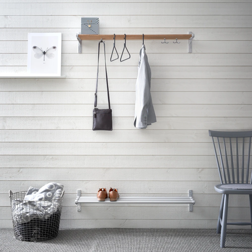 The Nostalgi hat shelf was originally designed in 1937 by Gunnar Bolin and has since become an iconic classic of Swedish design. The hat shelf is made of recycled aluminium paired with rounded bars of wood and metal. A versatile shelf, it can easily be made larger by joining several of the rounded bars together or smaller by shortening the rods themselves. The Nostalgi hat shelf is available in several colours and materials that each lend a stylish impression to the hall or entryway.